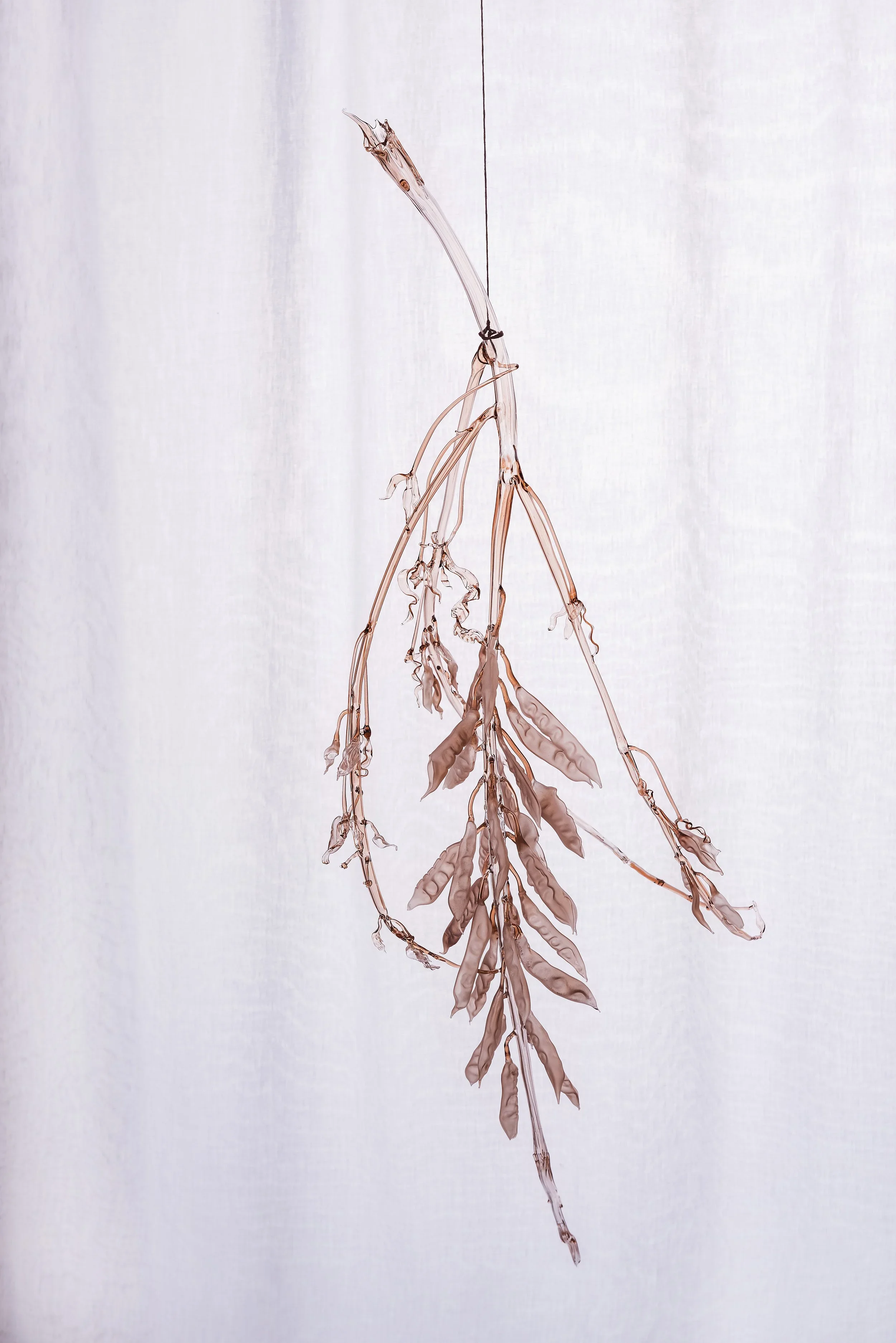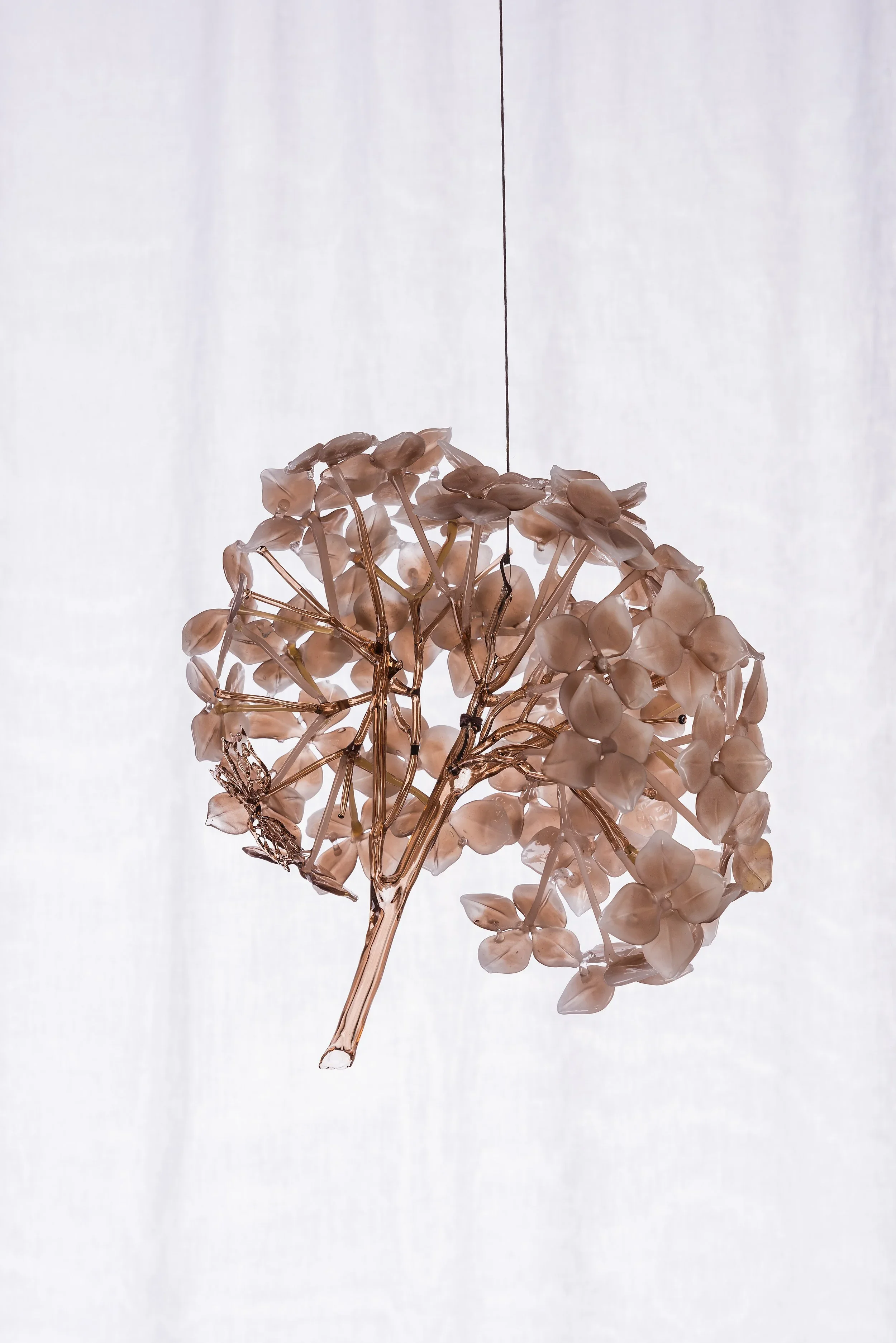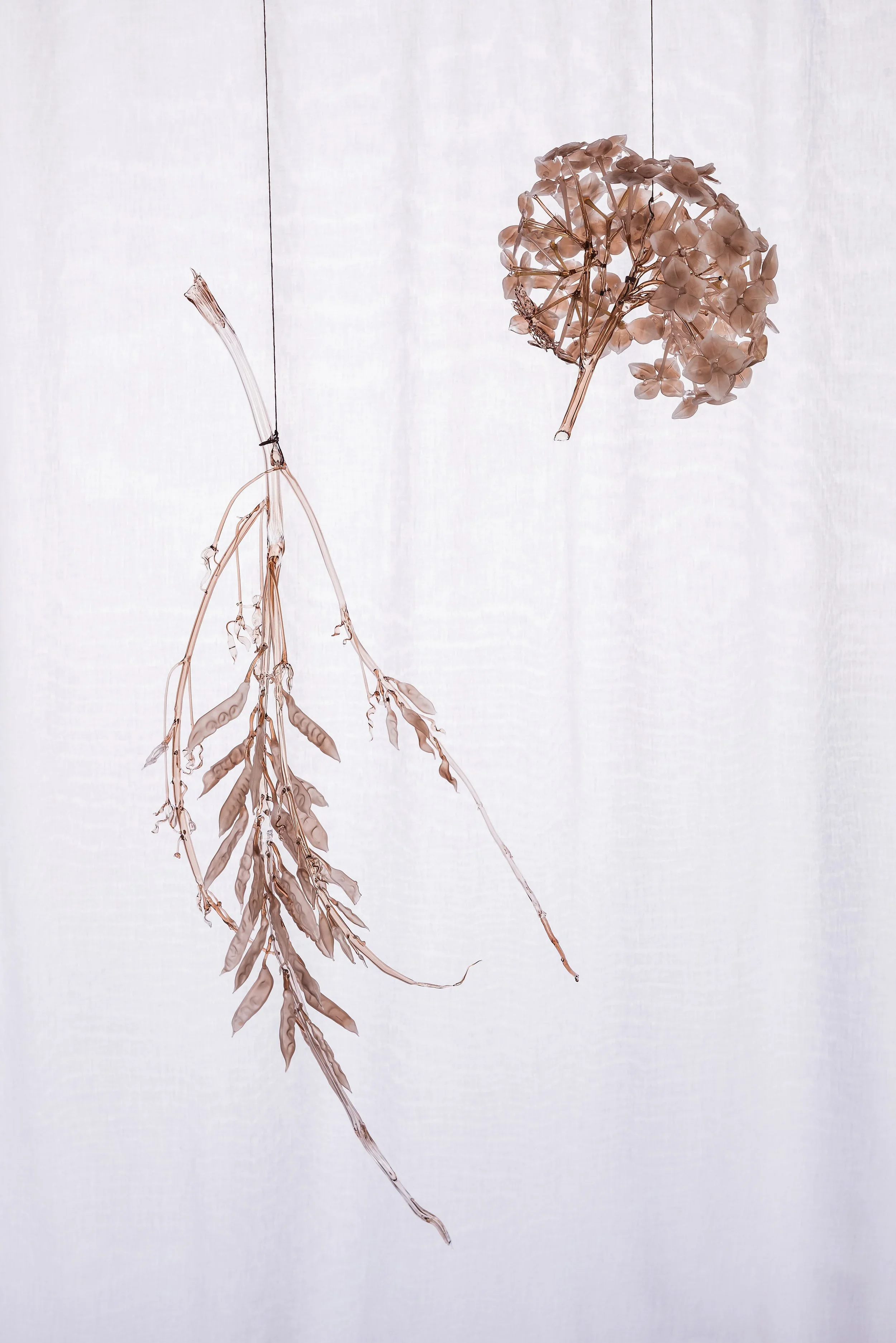 Human Nature continues a fascination with the connection between structures found in nature replicated in our human bodies. Inspired by a dried Hydrangea mop head and dried Lupin branch collected from my garden, I realised a connection between the plant specimens and the fragile, complex and complicated systems that support and underpin the human body. The Hydrangea mop head resembles aspects of the human brain, in shape and form. The delicate stems that support the flower heads branch off in pairs from a central axis, not unlike the structure of arteries and veins. The Lupin branch, with dried out seed pods, suspended upside down hints at a spinal cord. With this piece I aspire to illuminate humans’ mutuality with the earth and observe the edges where human nature and the natural world fuse.